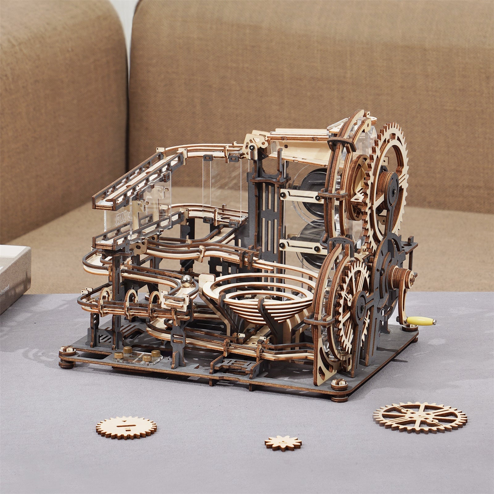 - [ All New Marble Run Model ] - The 294-pcs marble run3D Wooden Puzzle Model Kit is inspired by Rube Goldberg Machine, aiming to watch marbles racing down slides full of crazy twists and turns through tricky & fun devices!
