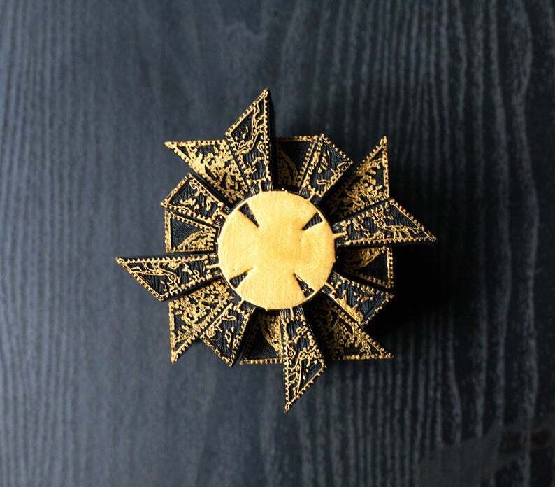 The puzzle box from Hellraiser, with option for a stand. This is a functional, moveable puzzle box that changes confirmation base on how you try to solve the puzzle with your hands. It is black and painted with deep bronze paint by hand to ensure a near perfect movie prop replica, colors and size. We have been making these for years, and we make the highest quality Lament Configuration on the internet, ESPECIALLY for the price. Ours is nearly 100% full of plastic, giving it a heavy feel that we imagine is similar to the real thing.