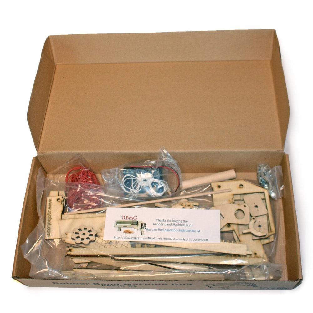 The Rubber Band Wooden Machine Gun ships as a kit of laser cut wood parts that you can assemble in about 30 minutes. Tools required are screwdrivers and pliers. Not only is it fun to fire rubber bands in full rock and roll mode, the kit is a great opportunity for education, hidden in a fun form. Learn about electric motors, and simple machines, then blast some soda cans into oblivion.
