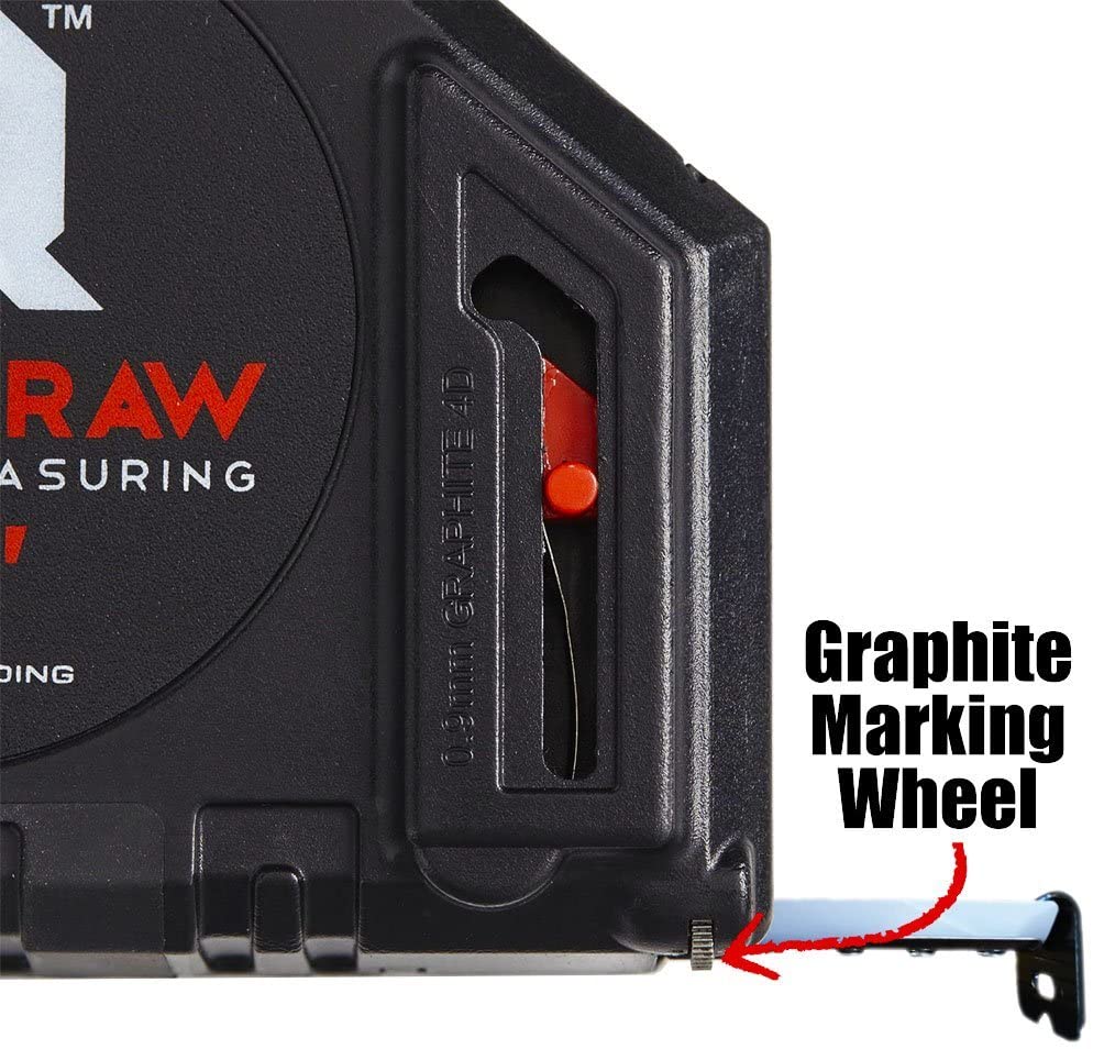 The Tape Measure is the FASTEST, most ACCURATE measuring device in the construction industry today. The patented graphite marking system comes preloaded and ready to mark. The internal steel wheel easily and accurately applies a graphite mark/line right where you want it. DON’T WASTE any more TIME LOOKING FOR OR SHARPENING A PENCIL!